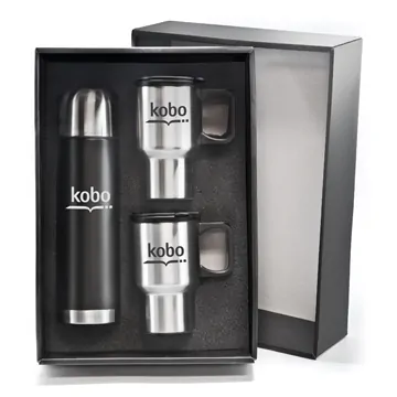 - 3-pc drinkware set includes a 750 ml vacuum bottle with push and pour mechanism and two 14 oz stainless steel mugs.