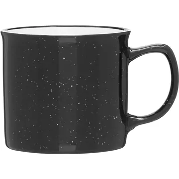 - 12 oz stoneware: glossy color out / glossy white in with black rim and speckles.