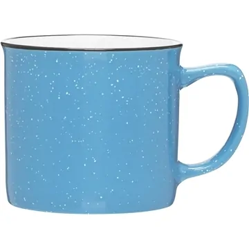 - 12 oz stoneware: glossy color out / glossy white in with black rim and speckles.