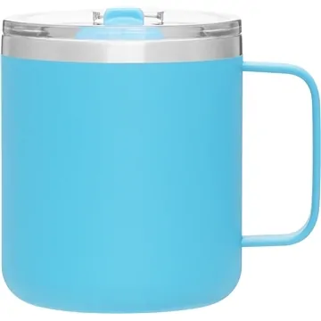 - 12 oz double wall 18/8 stainless steel thermal mug with copper vacuum insulation, stainless steel rim, clear push-on lid, swivel closure, and powder coated finish – gift box included.