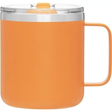 - 12 oz double wall 18/8 stainless steel thermal mug with copper vacuum insulation, stainless steel rim, clear push-on lid, swivel closure, and powder coated finish – gift box included.