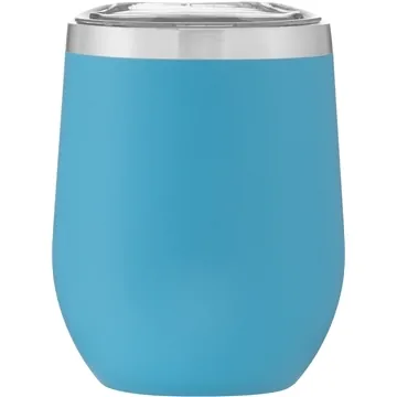 - 12 oz double wall 18/8 stainless steel thermal tumbler with copper vacuum insulation, stainless steel accent, clear push-on lid, and powder coated finish – gift box included.