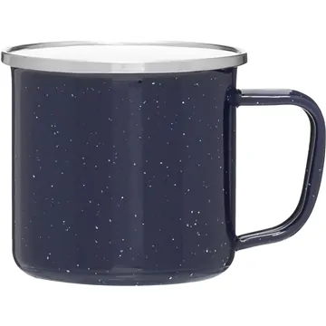 - 13 oz single wall enamel mug with glossy color out/ glossy white in, 18/8 stainless steel rim, and speckles