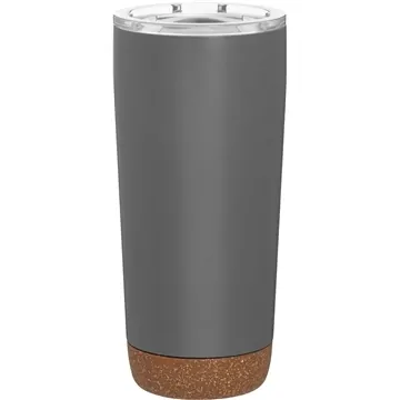 - 20 oz double wall 18/8 stainless steel thermal tumbler with copper vacuum insulation, clear push-on lid with sliding closure, and synthetic cork base – gift box included