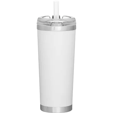 - 24 oz double wall 18/8 stainless steel thermal tumbler with copper vacuum insulation, stainless steel rim and base, threaded snap fit Tritanâ„¢ lid for hot/cold use and flexible wide silicone straw – gift box included.