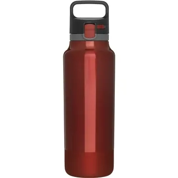 - 25 oz double wall 18/8 stainless steel thermal bottle with copper vacuum insulation, threaded one-touch push-button lid, locking mechanism, carrying handle, and rubberized base · patent pending · gift box included