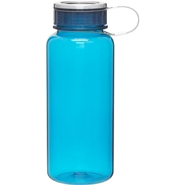 - 33.8 oz single wall [BPA-free] Eastman Tritan copolyester bottle with threaded lid, stainless steel accent, and braided coated wire carrying loop