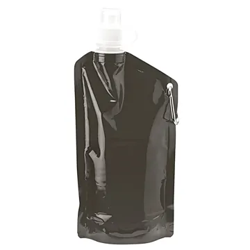 - 24 oz. PE plastic water bottle features a drinking spout, safety strap on lid, flattens for easy transport, includes a 50mm aluminum carabiner clip and is BPA-free.