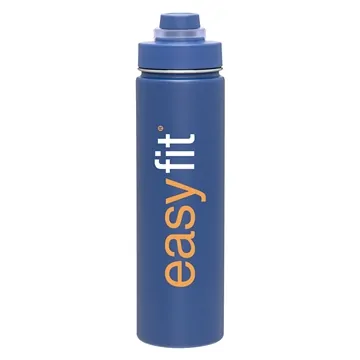 - 24 oz double wall 18/8 stainless steel thermal bottle with copper vacuum insulation, matching threaded lid, drinking spout, hinged cap, carrying handle, and powder coated finish