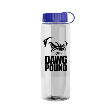 - 32 oz Transparent Sports Bottle with Tethered Lid.