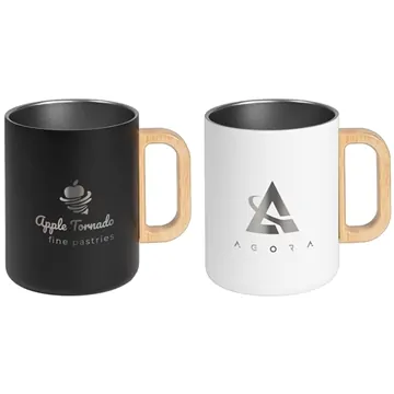- Our Vancouver 15 oz double wall stainless steel mug is powder coated for a durable, attractive finish, and it features a stylish bamboo handle.